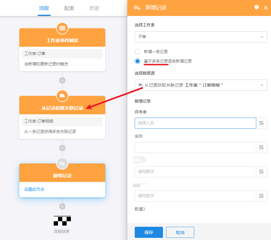 例如,获取某个订单中订单明细的子表数据。通过“获取多条数据”节点 的 “从记录获取关联记录” 的方式,获取到其子表数据。