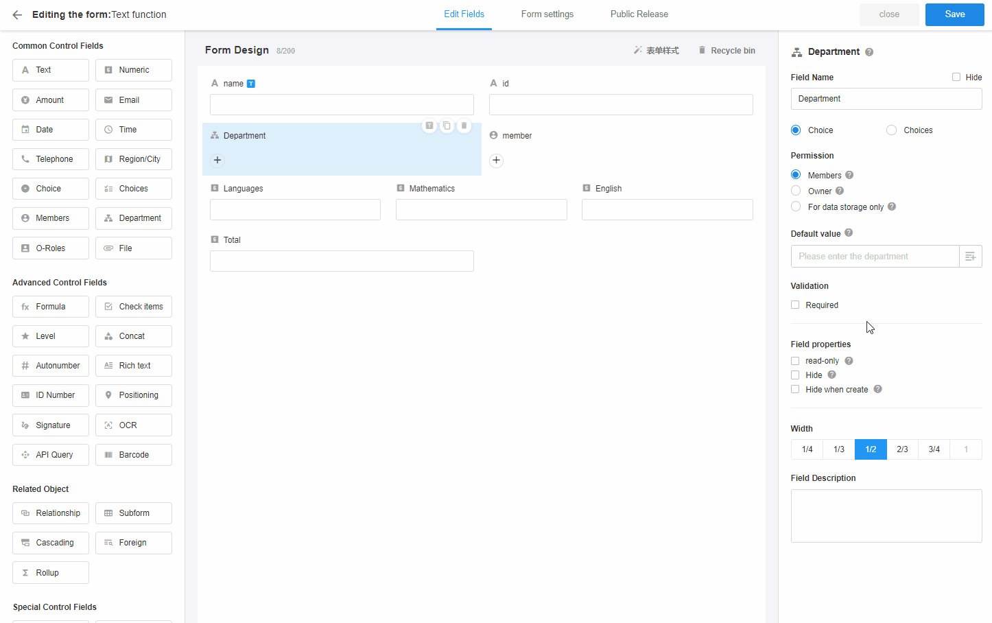 Fields that can be used as parameters of the function: text, numeric, amount, email, telephone, date, choice, choices, members, department, check items, region/city, ID Number, sub-form
