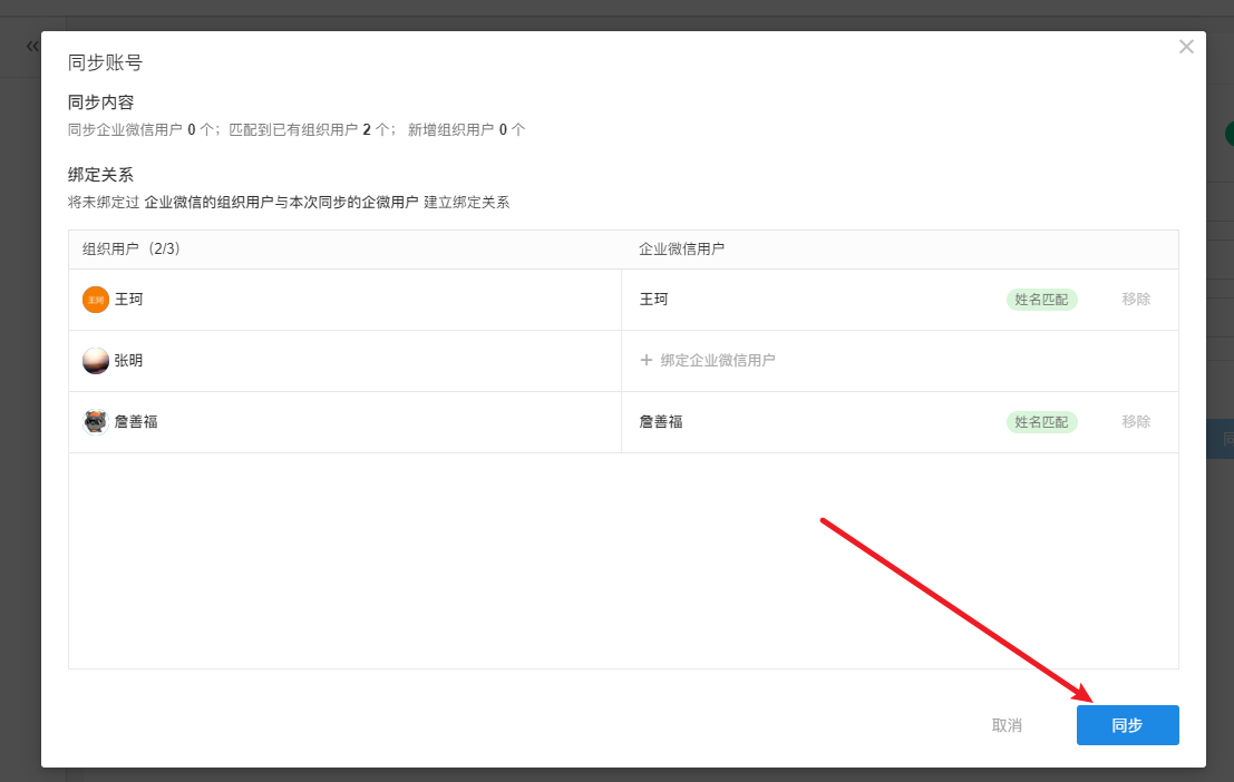 选择完成账号绑定关系后,在上方会有本次同步的信息汇总