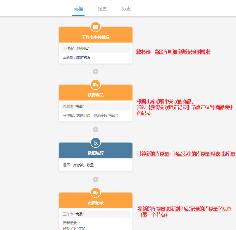 流程中,如果想要修改一条记录或多条记录的内容,在工作流中必须要定位到它/它们,即有1个节点必须指向它们, 可以通过 【查找指定数据】、【获得指定关联记录】【获得批量数据】 等定位到,然后再修改他们的记录内容。