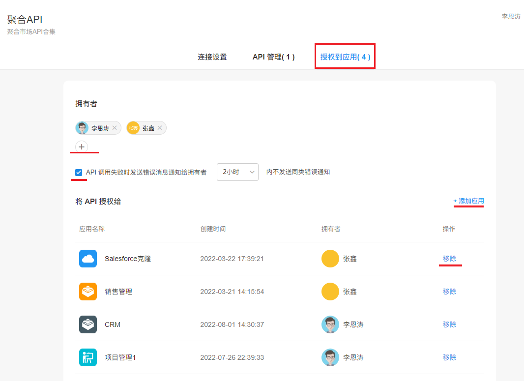 集成中心配置好的API,需要配置连接的拥有者,错误提醒机制和授权应用,获得授权才能直接调用。