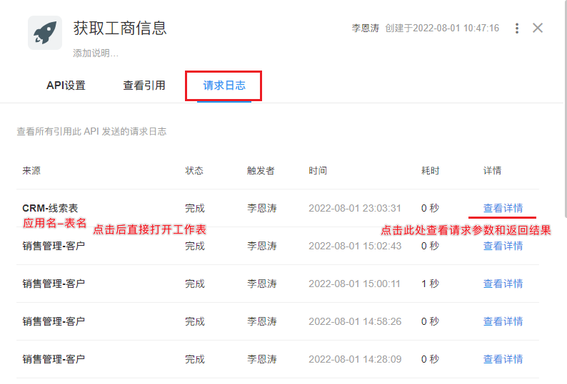 可以查看所有引用此 API 发送的请求日志。 无权限人员不能查看日志。
