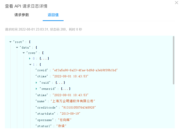 配置完毕后,点击[测试API],输入测试参数,即可返回请求的数据。