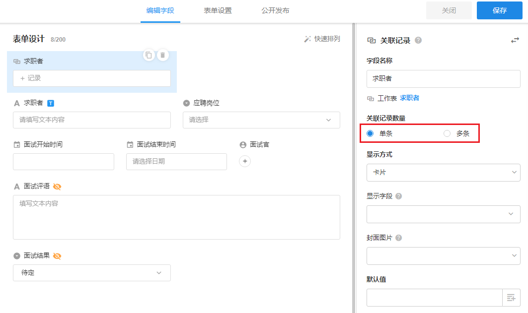 我们在《面试安排》表中配置关联求职者,关联记录数量的意思就是,一次面试,可以关联(调用)几个求职的信息。在本需求场景中,每次面试只能面试一个人。所以,选择【单条】,意思是如果关联求职者,最多只能关联1条。