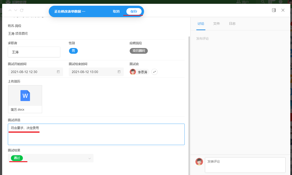 打开一个面试记录,修改面试结果为:通过,并保存。