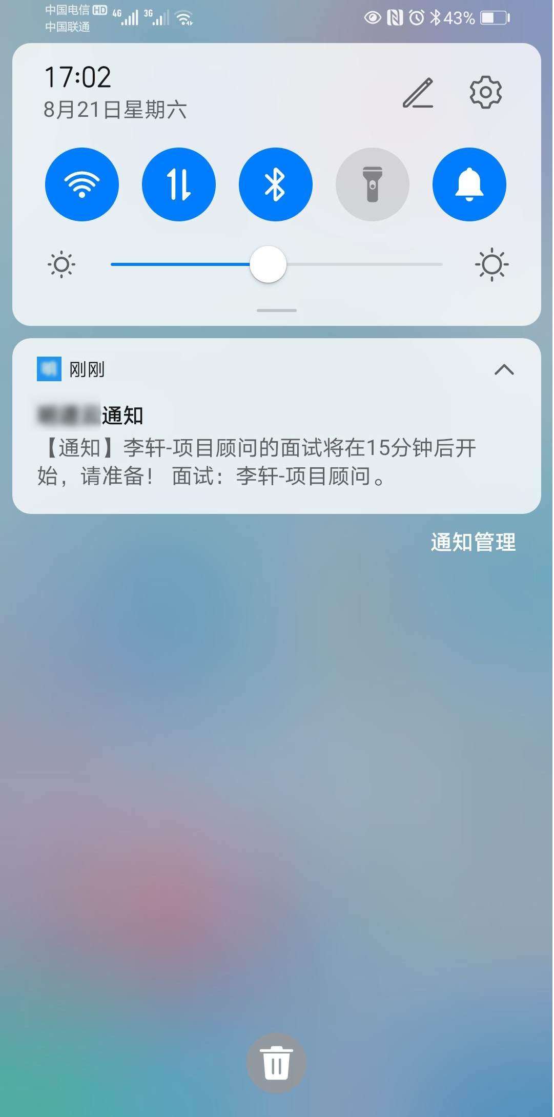(我们在测试时,可以把面试时间调整为 当前时间的17分钟后,这样我们只需等2分钟就可以收到通知了。)
