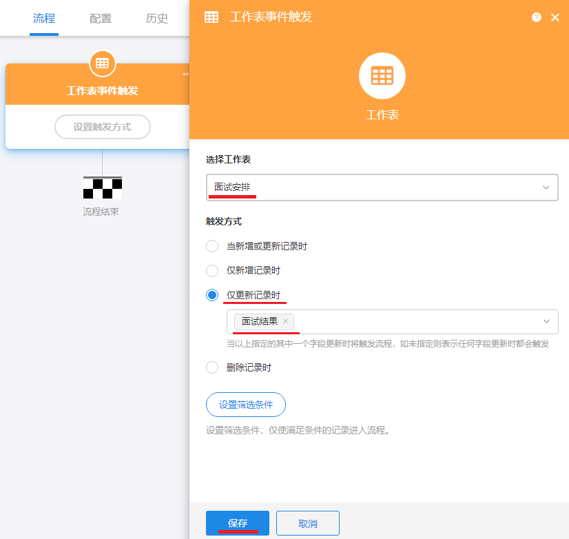 监听《面试安排》工作表的数据,且只有”面试结果字段“的数据有更改时,才能触发流程。